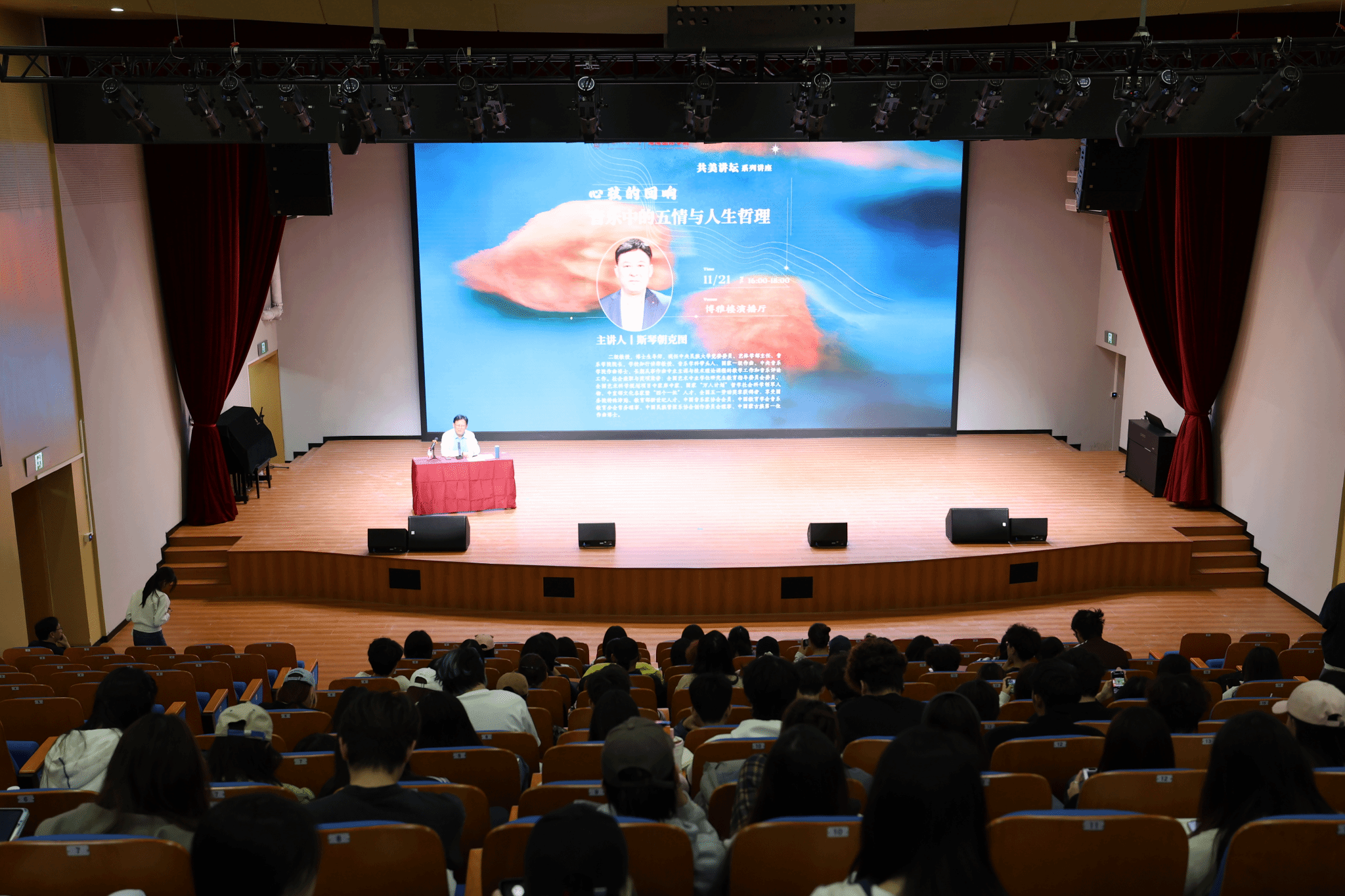 11月21日下午,中央民族大学海南国际学院博雅楼演播厅内哲思涌动、心弦回响,第十四期“共美讲坛”系列学术讲座在此顺利开展。中央民族大学音乐学院院长斯琴朝克图教授应邀主讲,以“心弦的回响:音乐中的五情与人生哲理”为主题,为试验区师生及学院各专业学子带来一场融艺术审美与哲学思辨于一体的精神盛宴。