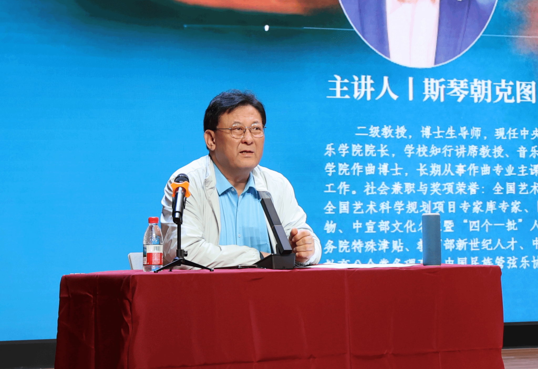讲座伊始,斯琴朝克图院长以“五情”——乡情、亲情、友情、爱情与家国情为脉络,系统阐释了情感在音乐创作中的核心地位。他特别强调乡情作为艺术创作的情感根基,结合个人代表作与家乡文化符号,通过细腻的旋律分析与生动的作品演绎,展现了乡愁如何化为音符中的深沉底色。