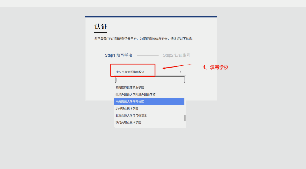 首次登录后,学生将进入到认证页面。学生需要先填写自己所在的学校【中央民族大学海南校区】,填写完成之后,点击“下一步”,进入账号认证界面。选择“学生”的身份后,输入学号及学生姓名。