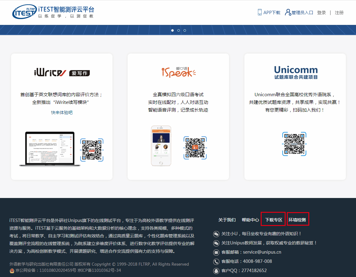 l 基础操作问题:请优先至https://itestcloud.unipus.cn页面下方,点击“在线咨询”。